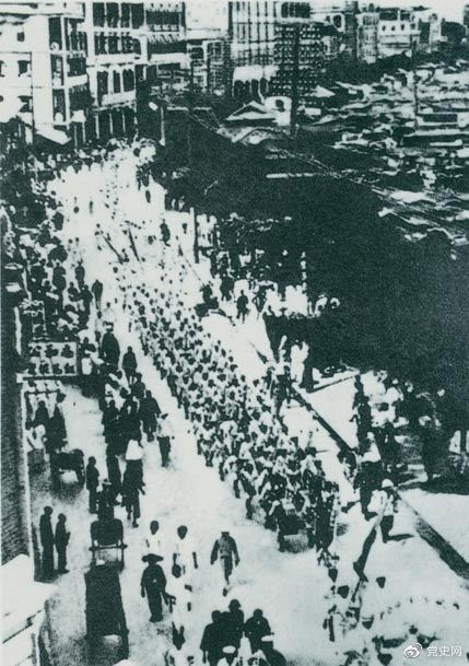 從1925年6月19日起,香港和廣州租界的20萬工人舉行罷工,聲援上海人民的反帝斗爭。23日,廣州和由香港回廣州的工人10萬余人舉行大游行,在沙基慘遭英、法帝國主義的鎮(zhèn)壓。圖為當時的游行隊伍。