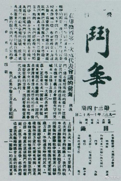 1933年11月5日,劉少奇主持中央蘇區(qū)農(nóng)業(yè)工會(huì)十二縣查田大會(huì),并作總結(jié)報(bào)告。圖為《斗爭(zhēng)》第34期刊登的目錄。